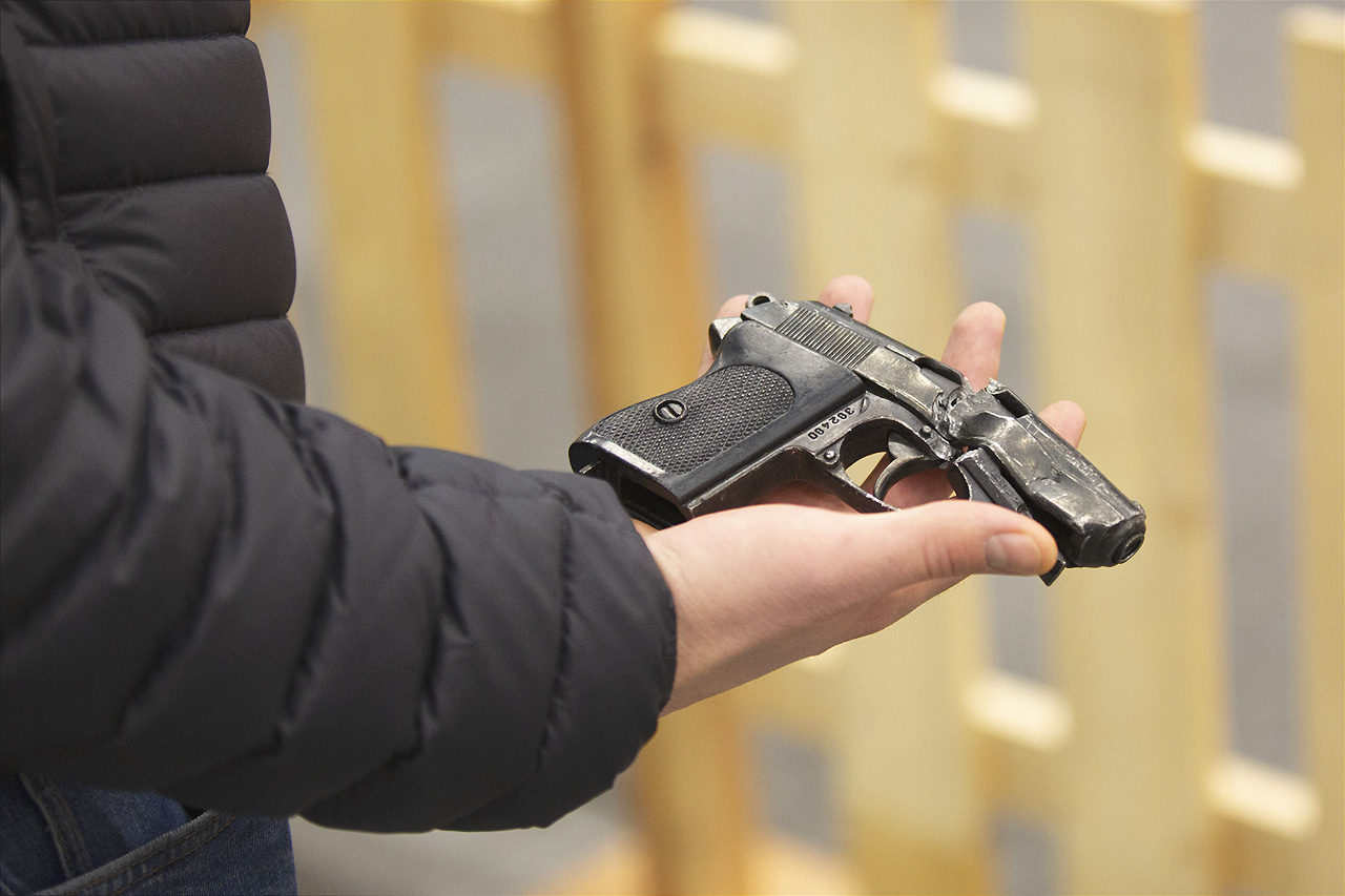 Makulerad och förstörd pistol för tjänstehundsträning.