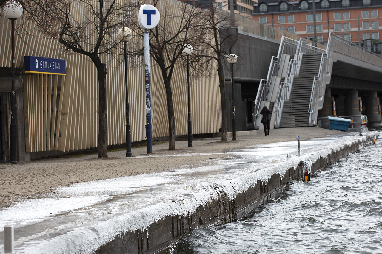Vågorna har slagit upp på Munkbrohamnens kaj och frusit till is bara några meter från stationsingången till Gamla Stans T-bana.