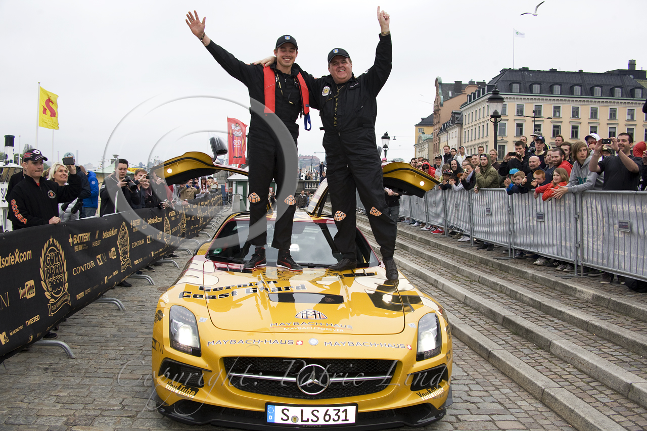 Gumball 3000 rallyt startade i Köpenhamn och väntades till Stockholm på söndagseftermiddagen. Det blev lite försenat men vid 17-tiden rullade den första Gumballbilen in uppställningsfickan på Skeppsbron nedanför Kungliga Slottet i Stockholm. När Mercedersens måsvingar veks upp strömmande klassisk musik ur den snabba lyxbilen. Chauffören sa att de bara hade stoppats en gång av polisen men att de hade kört lugnt på vägarna för att bilen är så pass ny att den knappt är inkörd. Men på en vägsträcka testades hästkrafterna som sparkade upp kärran i 250 knyck. En som däremot fick ta det väldigt lugnt var skidstjärnan Jan Olsson som fick en efterhängsen MC polis i backspegeln som hängde med en bra bit i laglig fart på E4:an, men till slut kom även Olsson upp till Stockholm. I årets rally startade 150 bilar men det var långt ifrån alla som kom in till Skeppbron, utan de åkte direkt till Finlandsbåten i Värtan för att ta sig över till ÅBO där rallyt fortsätter.