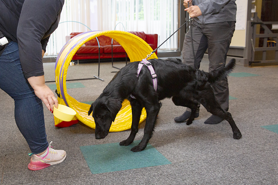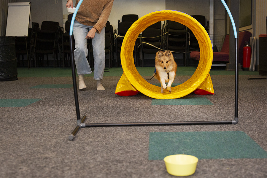 Selma 6 månader, Flatcoated retriever hade aldrig sprungit i tunnel tidigare. Hon visste inte riktigt vad och hur. Men en motivationshöjning för att uppmärksamma henne på skålen fick henne att ta vägen genom tunneln då hon såg belöningen nästa gång hon prövade. Snyggt jobbat Selma