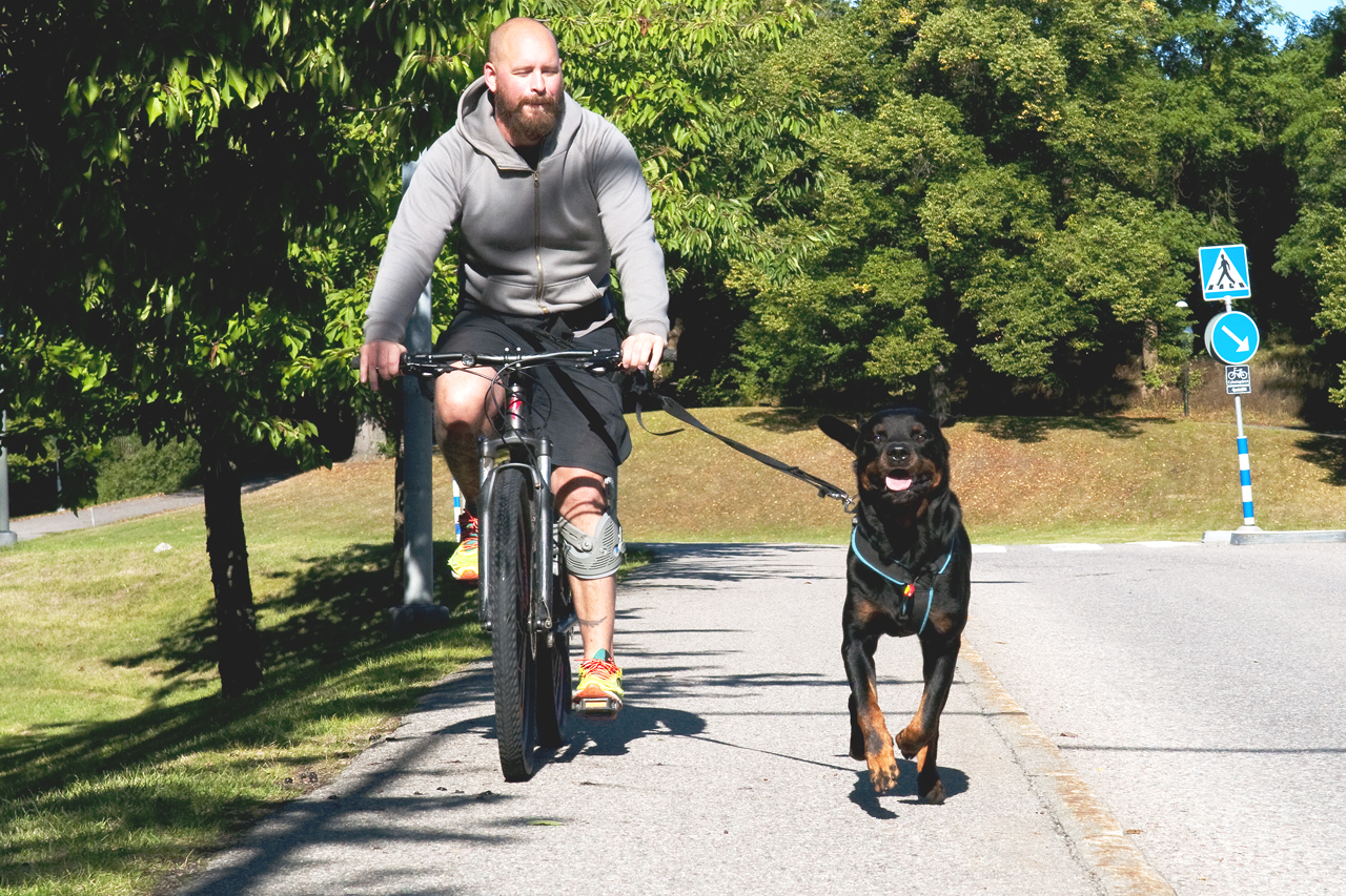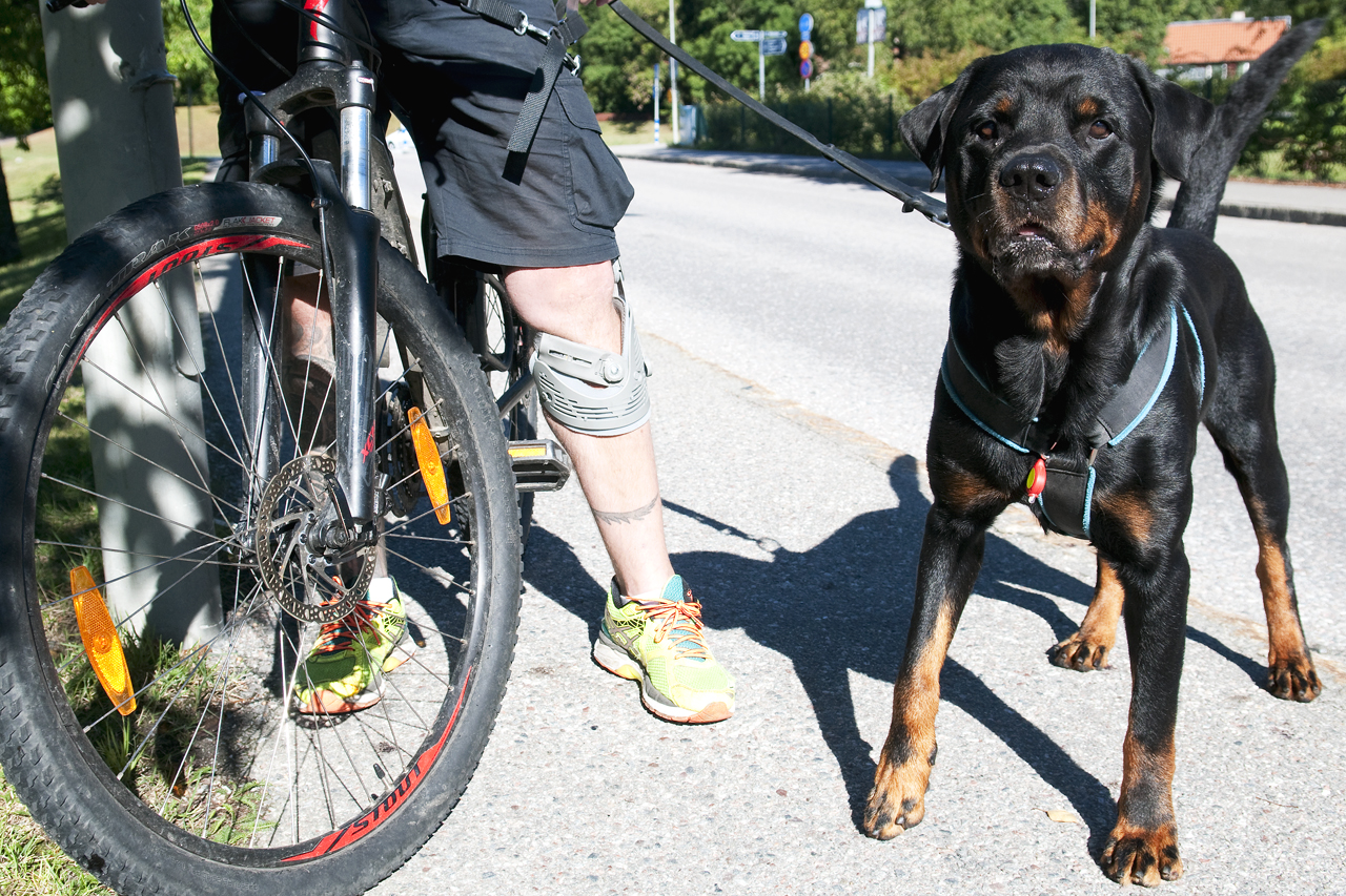 Draghunden Jack lättar belastningen på knät vid cykelturen. © Foto: Patric Lindén / Internetfoto