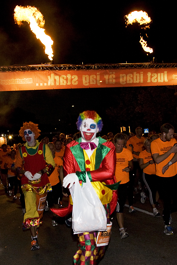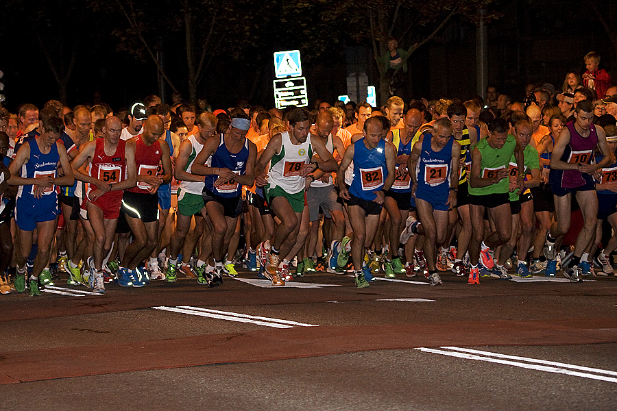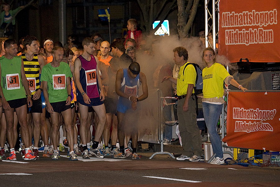 Först genomfördes det lilla midnattloppet där ungdomar sprang, när klockan närmade sig 21:30 var det startdags för elitgruppen som var den första löpargruppen som släpptes iväg. Eld, rök och en hejande publik skapade en riktigt häftig stämning. (klicka på första bild och bläddra sedan med piltangenterna)