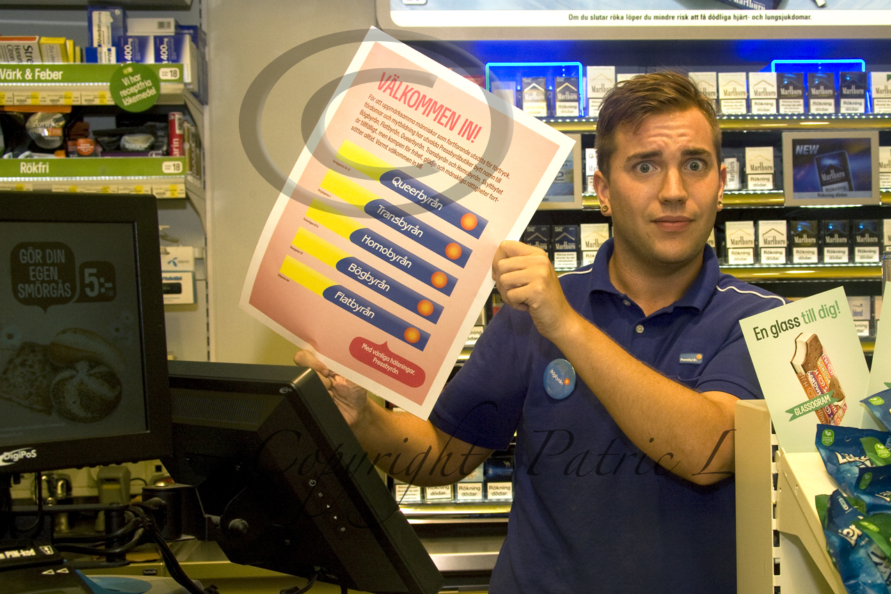 Många människor som går in för att handla eller som bara passerar butiken och sneglar upp på butiksnamnen plockar upp mobiler och kameror medan de leendes fotar butiksskyltar som: Flatbyrån, Bögbyrån, Queerbyrån, Transbyrån och Homobyrån.