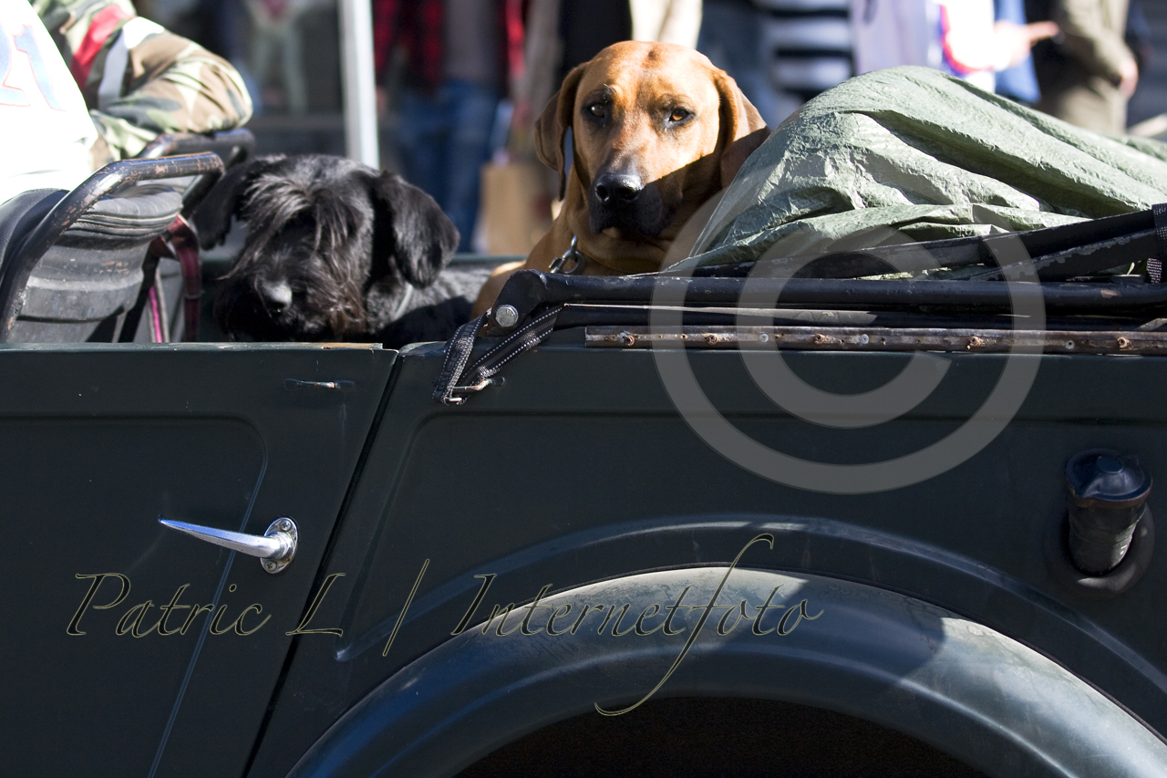 Rhodesian Ridgeback och Riesenschnauzer i cool Jeep