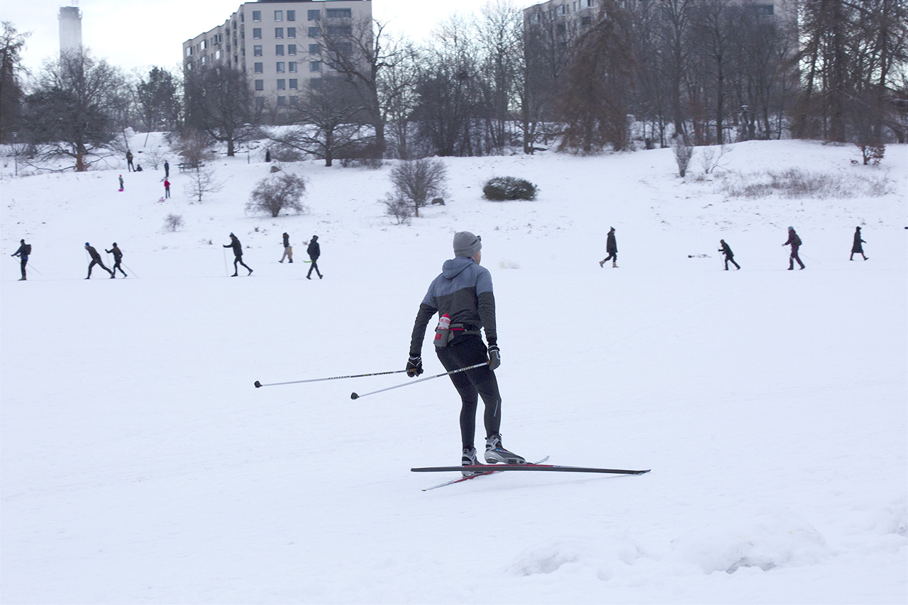 Trots att det har varit riktigt kallt den senaste tiden är det inte speciellt mycket snö i Stockholm. På Gärdet står grästuvorna upp lite här och där och ställer till det för längdskidåkarna.