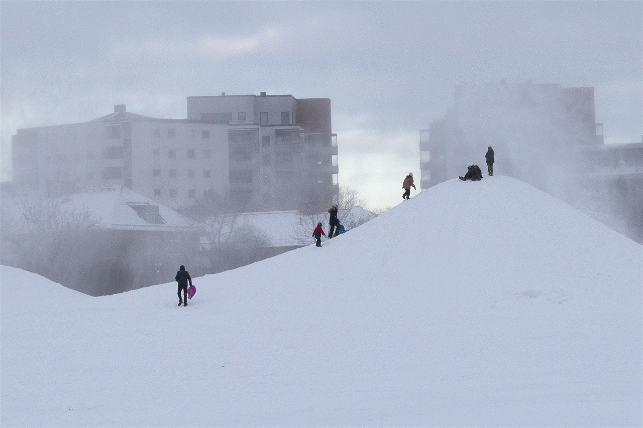 Men högen växer och extra varmklädda ungar älskar det. Pulkarace i vinande snöyra mitt i Stockholm är inte vanligt. Platsen gav också möjlighet att rent av kunna uppleva polarexpedition i full storm.